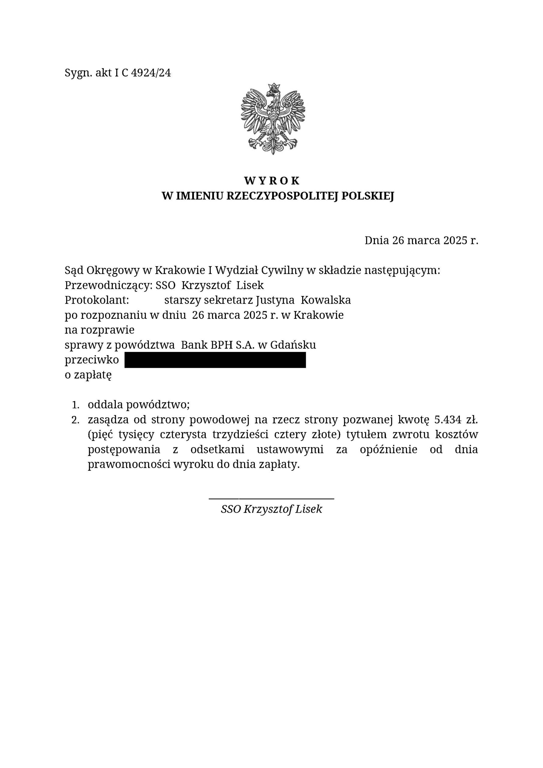 26 marca 2025 r. Sąd Okręgowy w Krakowie, w sprawie o sygn. akt I C 4924/24, oddalił powództwo Banku BPH S.A. również w związku ze złożonym przez Kredytobiorców oświadczeniem materialnoprawnym o potrąceniu wzajemnych wierzytelności. Bank złożył wniosek o uzasadnienie wyroku.
